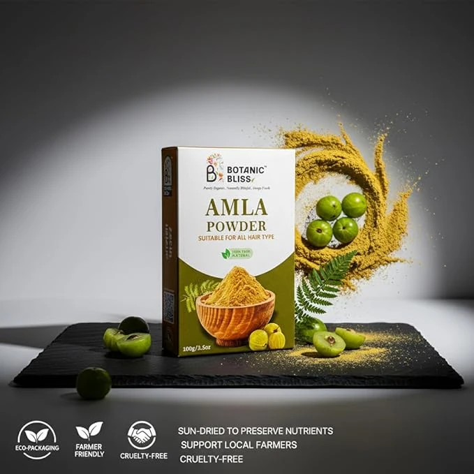 Amla powder is a powerful Ayurvedic herb known for strengthening hair from the roots. Rich in vitamin C and antioxidants, it helps reduce hair fall, prevent premature greying, and promote natural shine. Regular use nourishes the scalp, improves hair texture, and supports healthy hair growth.