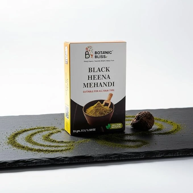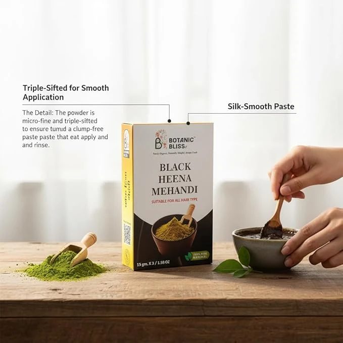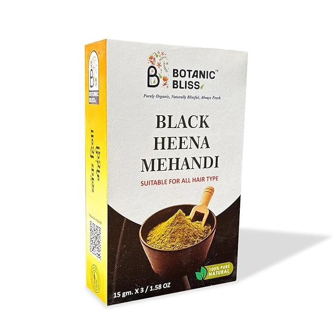 Mix Black Heena Mehandi with water to make a smooth paste. Apply evenly from roots to tips. Leave for 30–45 minutes, then rinse thoroughly with water. Avoid shampoo for 24 hours for best color results.