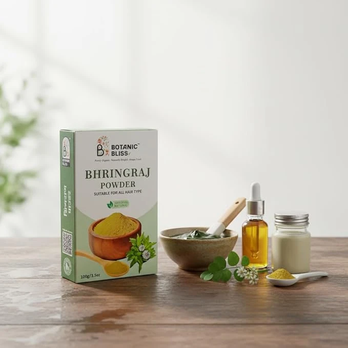Bhringraj powder is traditionally used to promote hair growth and maintain scalp health. It helps reduce hair fall, strengthen hair follicles, and improve blood circulation to the scalp. Regular application supports thicker, darker, and healthier-looking hair while calming scalp irritation.