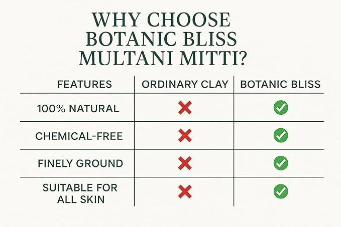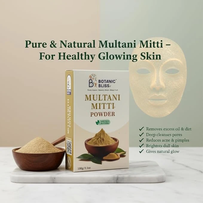 Regular use of Multani Mitti powder helps reduce acne, pimples, blackheads, and blemishes by detoxifying the skin and improving blood circulation. Its natural cooling properties soothe irritated skin, calm inflammation, and provide instant freshness. Multani Mitti also helps in skin tightening, improving texture, and enhancing natural brightness.