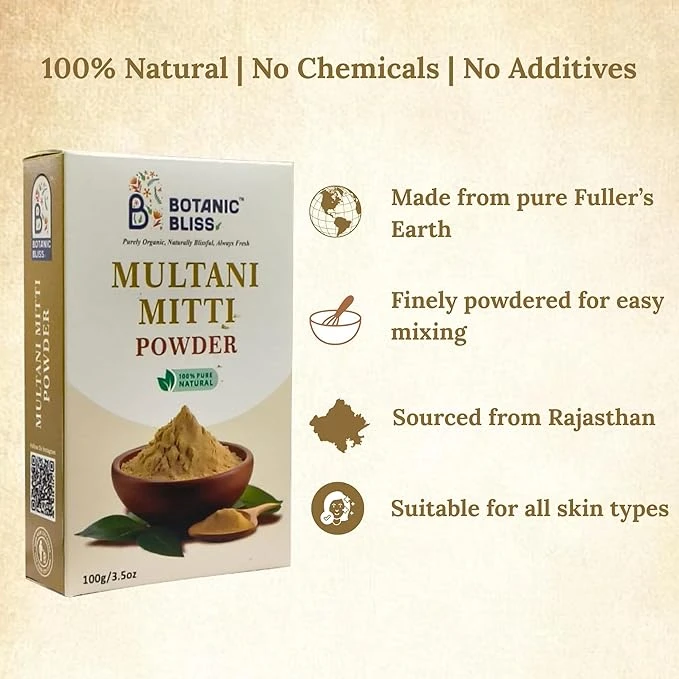 Mix Multani Mitti powder with rose water, plain water, or milk to form a smooth paste. Apply evenly on face and neck, leave for 10–15 minutes, and rinse with water. Use 1–2 times a week for best results.