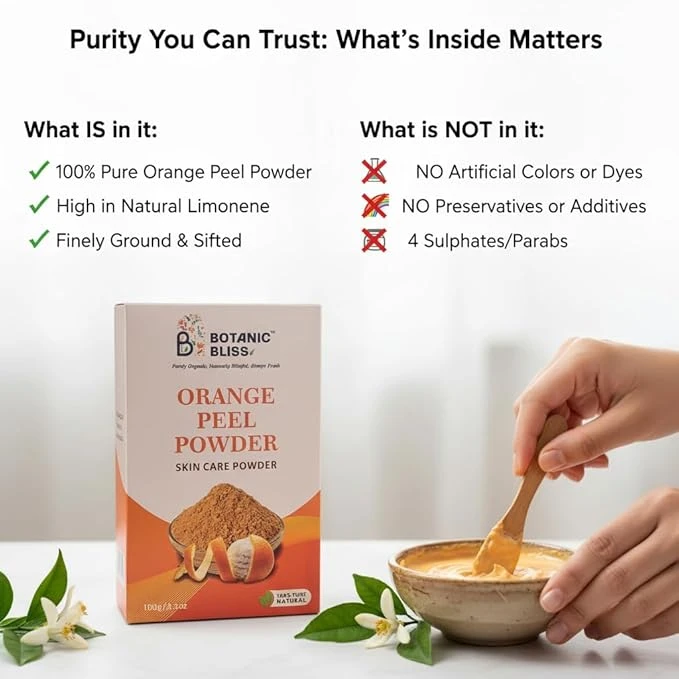 Free from artificial colors, preservatives, parabens, and fragrances, orange peel powder is a safe, eco-friendly, and effective solution for naturally glowing and healthy skin.