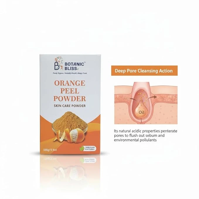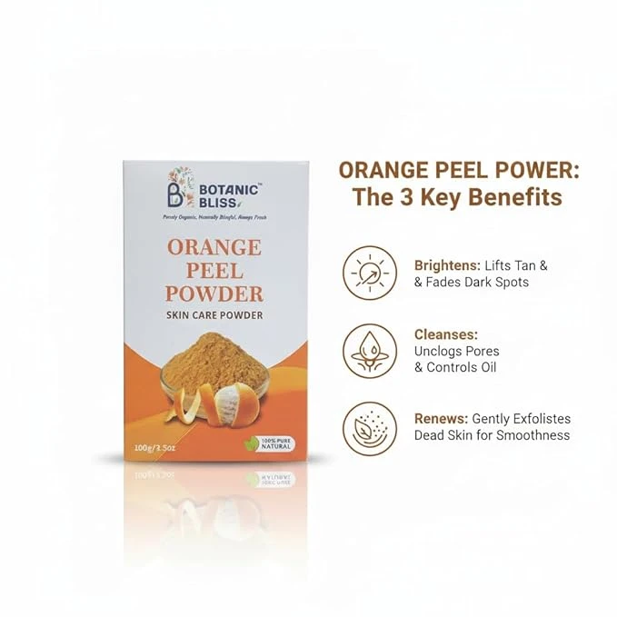 Regular use of orange peel powder helps brighten dull skin, reduce tan, pigmentation, and dark spots, and promote an even skin tone. Its natural exfoliating properties gently remove dead skin cells, unclog pores, and help reduce blackheads and whiteheads, leaving the skin smooth and refreshed.