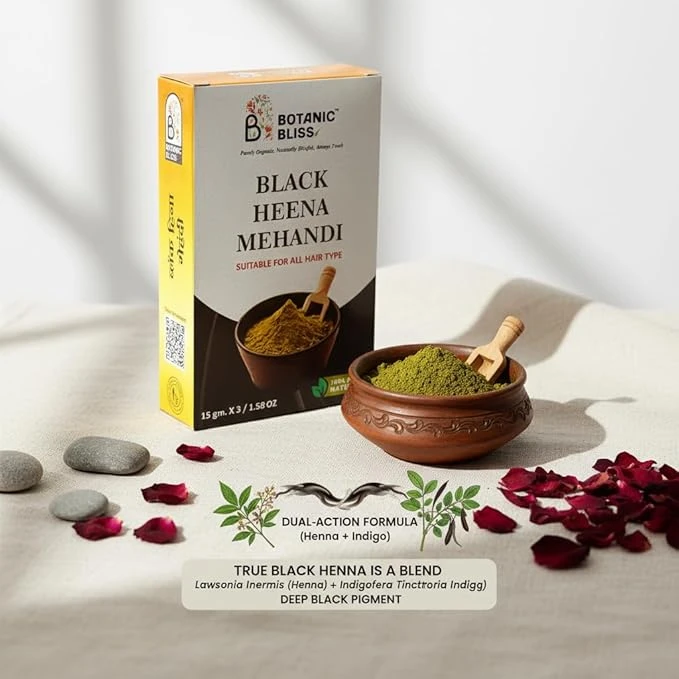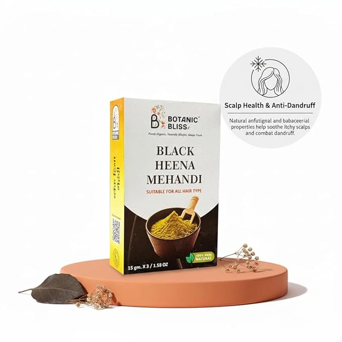 Mix Black Heena Mehandi with water to make a smooth paste. Apply evenly from roots to tips. Leave for 30–45 minutes, then rinse thoroughly with water. Avoid shampoo for 24 hours for best color results.