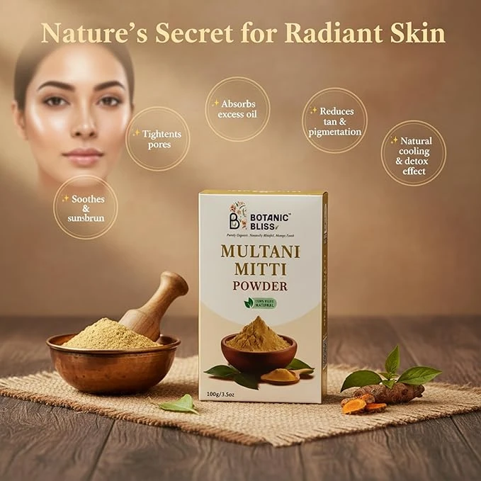 Regular use of Multani Mitti powder helps reduce acne, pimples, blackheads, and blemishes by detoxifying the skin and improving blood circulation. Its natural cooling properties soothe irritated skin, calm inflammation, and provide instant freshness. Multani Mitti also helps in skin tightening, improving texture, and enhancing natural brightness.