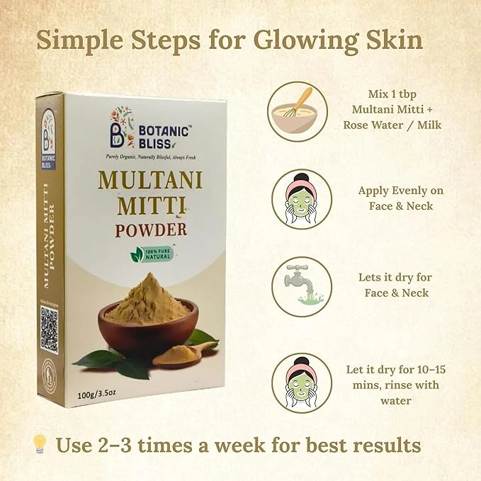 Mix Multani Mitti powder with rose water, plain water, or milk to form a smooth paste. Apply evenly on face and neck, leave for 10–15 minutes, and rinse with water. Use 1–2 times a week for best results.