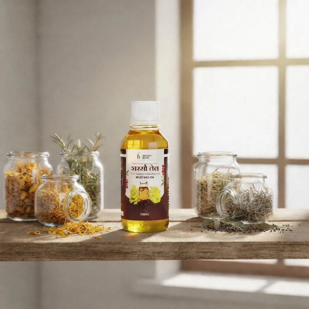 Sarso Tel is widely used in Ayurveda for its Ushna (warming) and Vata-Kapha balancing properties.