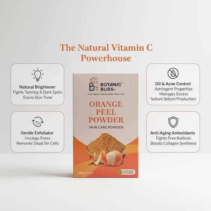 Regular use of orange peel powder helps brighten dull skin, reduce tan, pigmentation, and dark spots, and promote an even skin tone. Its natural exfoliating properties gently remove dead skin cells, unclog pores, and help reduce blackheads and whiteheads, leaving the skin smooth and refreshed.