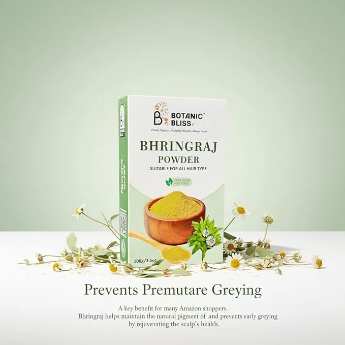 Bhringraj powder is traditionally used to promote hair growth and maintain scalp health. It helps reduce hair fall, strengthen hair follicles, and improve blood circulation to the scalp. Regular application supports thicker, darker, and healthier-looking hair while calming scalp irritation.